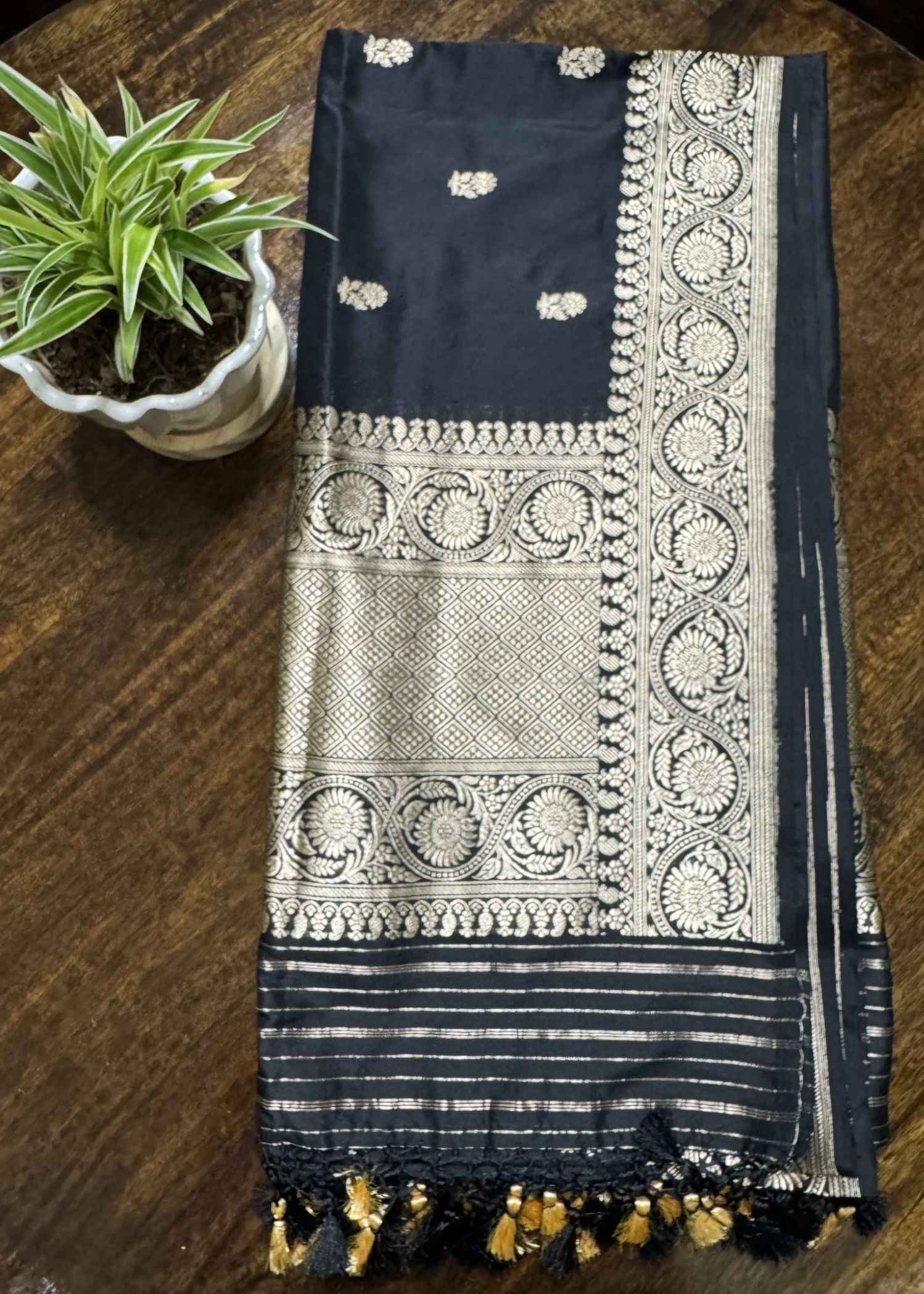Immerse yourself in the luxurious texture of pure Katan silk, known for its unmatched softness and subtle sheen. The intricate Kadhua technique, passed down through generations, adorns this dupatta with delicate booties that tell a story of heritage and artistry. Perfect for special occasions or adding a touch of sophistication to everyday attire, our Black Pure Katan Silk Handloom Kadhua Booty Dupatta promises to be a cherished addition to your wardrobe. Embrace the essence of luxury and tradition with every drape, making a statement of refinement and grace. Indulge in the allure of timeless beauty and craftsmanship with this exquisite dupatta from our Virasath premium collection. Each piece embodies our dedication to quality and celebrates the rich cultural heritage of handloom weaving.