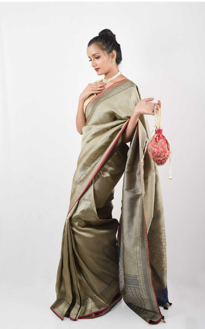 This graceful creation, displays the richness of finest silk with the gentle shimmer of gold zari. It showcases intricate khimkhwab patterns and eye catchy contrast red edge on a finely woven drape. The dull gold zari accents on the base of navy blue, crafting a timeless masterpiece.